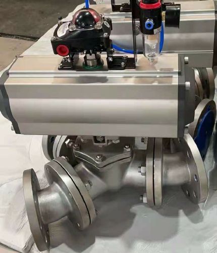 Q642F-氣動高平臺Y型三通球閥帶有高平臺,方便與氣動連接,閥體三個通口之間的角度可以是:180°-45°-135°,180°-90°-90°,157.5°-157.5°-45°,135°-135°-90°,112.5°-112.5°-135°,120°-120°-120°,滿足多種管道走線。
