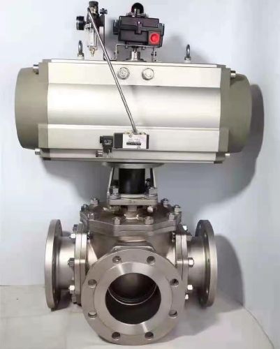Q644Y-氣動高平臺硬密封三通球閥,是由氣動執行器控制的,可遠控,氣動作用形式有雙作用和單作用的,單作用氣動有彈簧復位。